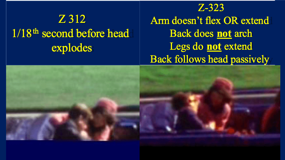 Figure 5. Image left, 1/18th second before his head explodes: JFK’s head is chin-downward, tilted forward and slightly to the left. Image right, ½ second after he’s hit, it is JFK’s head that has moved backward. His back does not arch. His right arm neither flexes inward in “decorticate” posture, nor extends in “decerebrate” posture, as it would were it a “neuromuscular reaction.” Instead, it falls limply to Kennedy’s side.