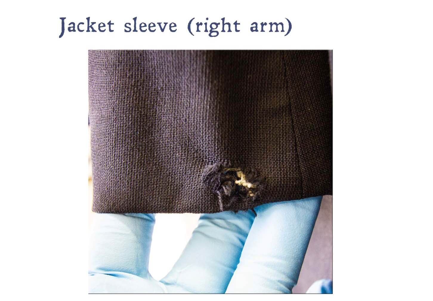 The problem for a theory of a single shot from the front at 313 means that the two points of windshield damage and Connally’s wrist wound must have all been made at the same time by fragments of a forward moving bullet at 328. Thompson is relying on Fitzgerald’s errant conclusion to reinforce his particular viewpoint. The WC testimony of Dr. Gregory is quoted here, as it was in Chapter 4 of Six Seconds in Dallas, citing his opinion that a fragment of a bullet caused Connally’s wrist wound rather than CE399. A critical revelation in the first book, omitted here, is that dark wool suit fibers were discovered in the wound. The entry holes in the jacket sleeve and French cuff must have been in alignment to have been pierced simultaneously. At frame 328, however, Connally’s French cuff is completely exposed out of the jacket sleeve. This is readily apparent in Photo 15–41 on page 233. The entry point in the jacket sleeve graphically depicted in the close-up photos is closer to the wrist than is diagrammed. In either case a bullet entering at any point in the jacket sleeve could not have entered the mid portion of the fully exposed French cuff to simultaneously carry dark suit fibers into the wound. This observation, in and of itself, makes this whole thesis untenable. See photos 1, 2, and 3.