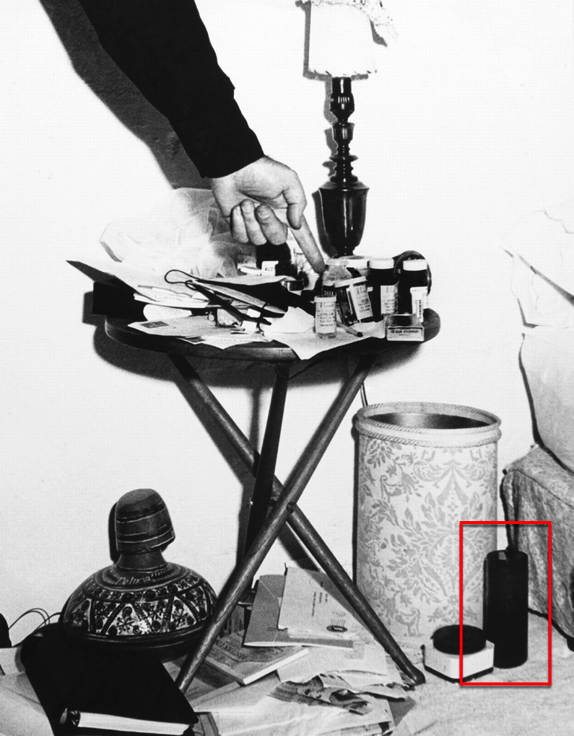 Displayed below is the actual, uncropped photograph taken that Sunday morning by police combined with an enlargement of the trash can area. Please note the drinking glass to the right of the trash can on the floor and to the left of Marilyn’s bed, a clearly visible drinking glass.