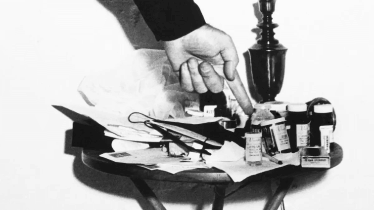 Police photographs snapped that morning revealed that Marilyn…had a glass at her bedside. One of these photographs depicted a policeman’s hand pointing at Marilyn’s cluttered bedside table, indicating the many prescription bottles resting thereon, and that photograph clearly revealed a glass… (p. 547)