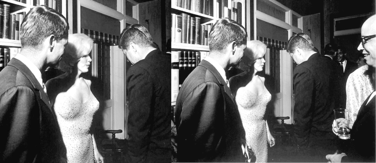 Within the pages of his book, Mark Shaw incorporates several photographs and he offers explanatory comments pertaining to each. However, his analysis is erroneous and, therefore, his comments about the photo depictions is seriously flawed. Of course, he trotted out the now famous photograph of Marilyn flanked by John and Robert Kennedy following the 1962 event at Madison Square Garden. This photo was taken during the after-party at Arthur Krim’s Manhattan penthouse. Shaw publishes the cropped version of the photograph, the usual tactic of cheapjack writers. Invariably, the photograph has also been darkened, suggesting that the famous trio engaged in a secretive and a serious discussion of such import they did not want to be overheard, but Shaw’s commentary about the photograph soars to an unprecedented level of misrepresentation and distortion. After implying that Cecil Stoughton, the White House photographer, actually timed taking the photograph so that the full faces of John and Robert would be hidden from view, Shaw declared: “Within moments, JFK, by all credible accounts, asked Marilyn to step into the shadows where RFK stood, and the three of them spoke for more than ten minutes.” (Shaw, p. 397) Shaw did not divulge exactly who delivered the alleged “credible accounts” or who conscientiously timed the conversation. At any rate, the actual photograph reveals a much less sinister looking encounter between Marilyn and the middle Kennedy brothers. The left-hand photograph in the panel displayed below is the cropped version used by Shaw, but the right-hand photograph is the actual snapshot as taken by Stoughton.