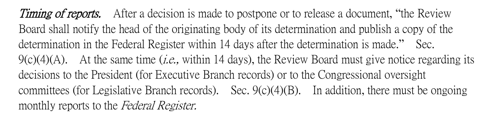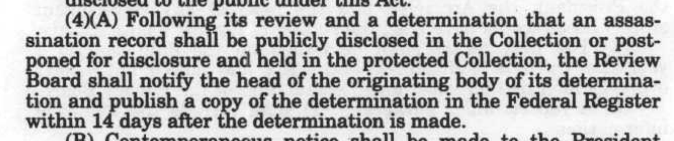 In drafting the JFK Records Act, Congress made clear that the overriding purpose of the statute was the complete and timely disclosure of all assassination records so that the American people could for themselves understand the true facts and history of the Kennedy assassination. The ARRB Final Determination Notifications were the pointy end of the legal spear created by Congress to ensure that the records would be released in a timely manner. As we will see below, Congress included provisions in the JFK Records Act that set in place mandated public disclosure of the ARRB’s decisions through the Federal Register and through several other forms of required reporting.