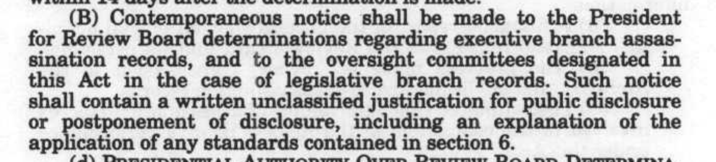 Section 9(c)(4)(B) [below] required the ARRB to give the President notice of determinations regarding decisions for executive branch records and notice to the respective oversight committee for non-executive (congressional) branch records originating from the House or the Senate. These reports became the ARRB Formal Determination notices.