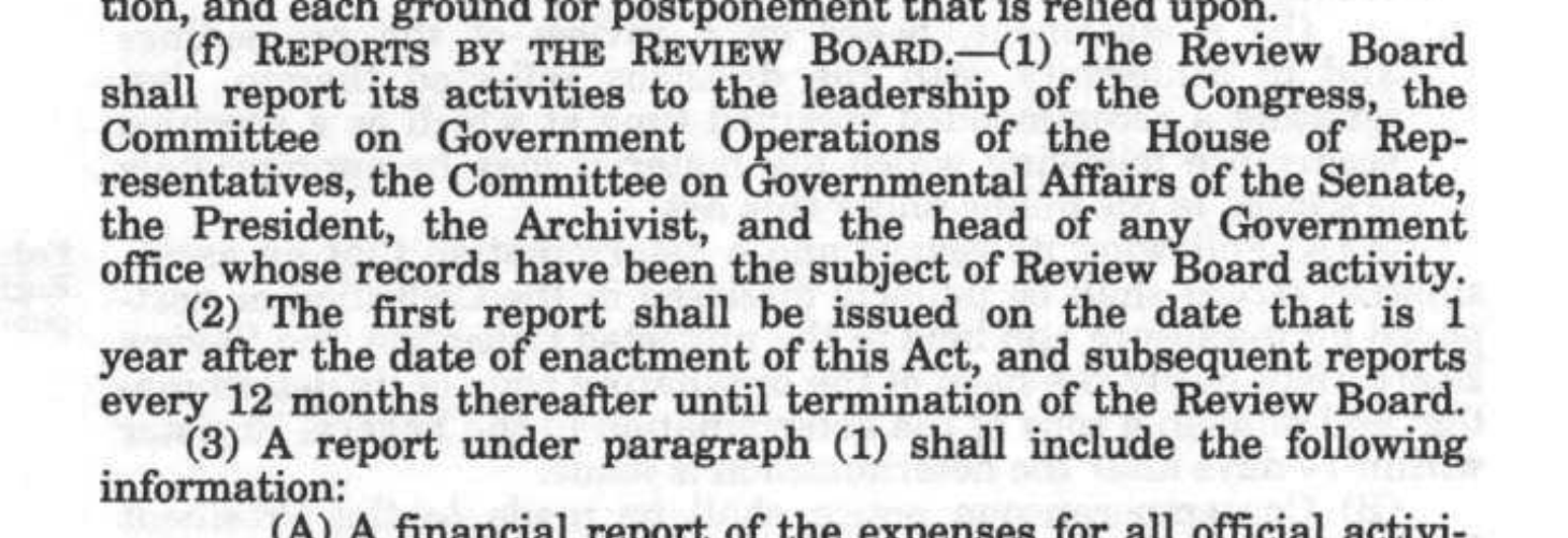In several sections in his Analysis of the JFK Records Act, ARRB Legal Counsel, Jeremy Gunn, correctly parsed out all of the reporting obligations of the ARRB [pp 5-6 and p. 16].