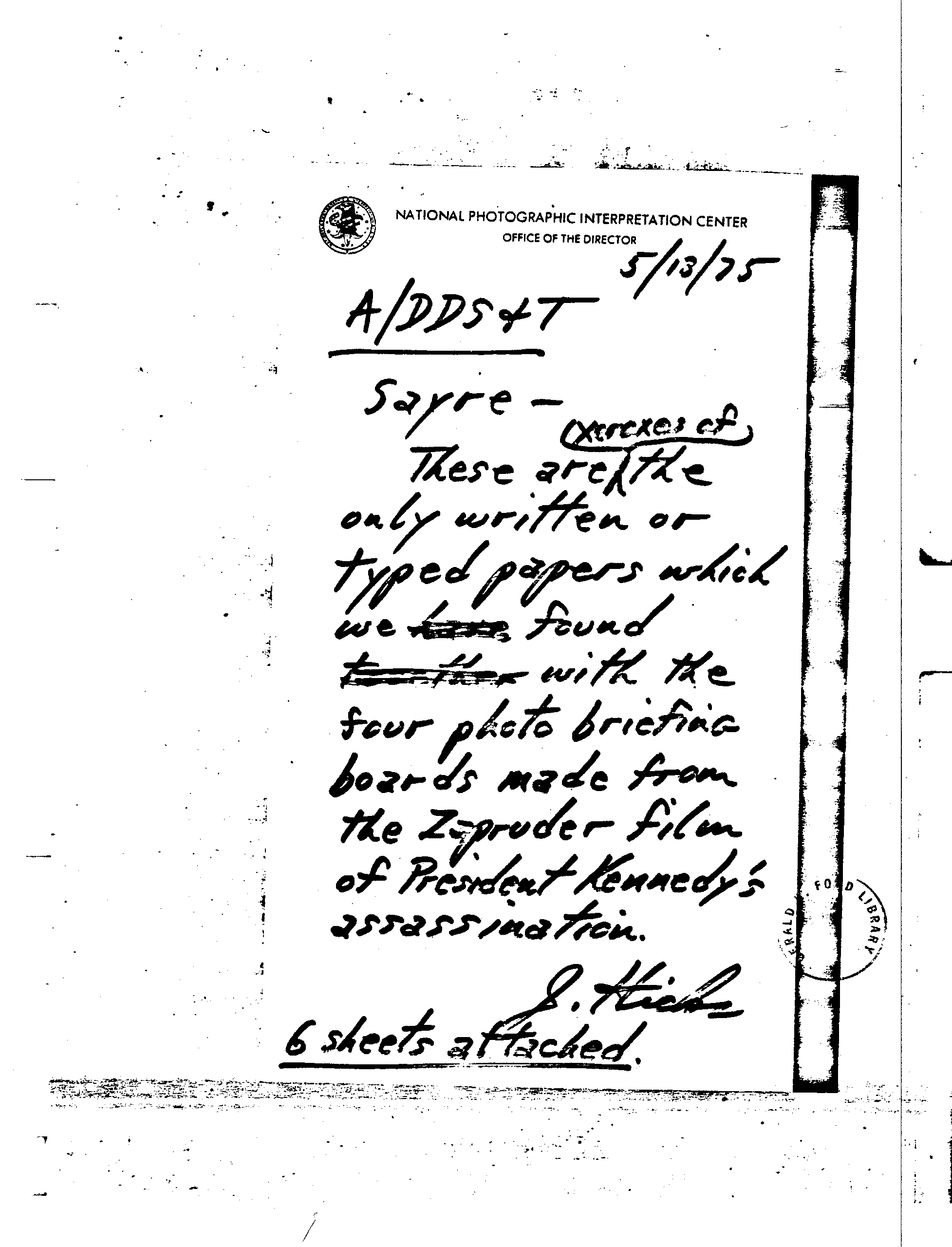 33 A handwritten note written by then NPIC Director John Hicks, Brugioni’s boss in 1975, attests that these are “the only known” documents available. In a 2009 interview, Brugioni recalled discovering one of his briefing boards from 1963 during the 1975 review, and that Hicks was distressed about this.