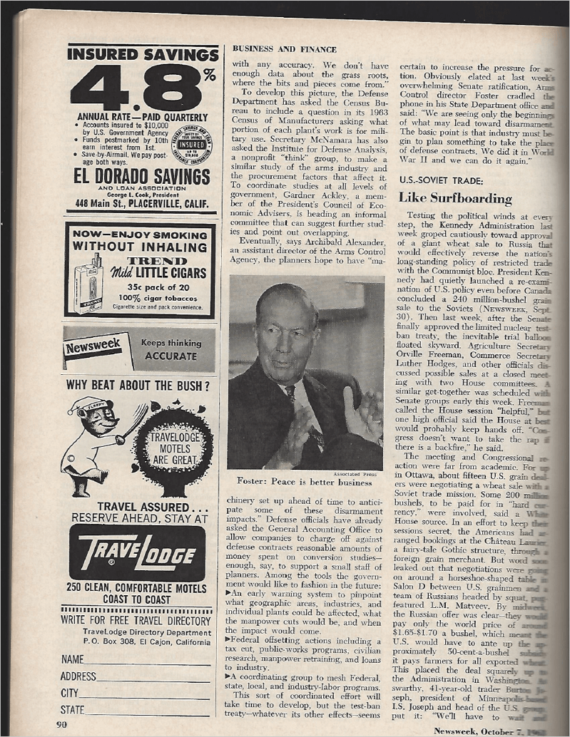 “I’ve never written for Liberty Lobby. I’ve spoken as a commercial speaker, they paid me to speak and then I left. They print a paragraph or two of my speech same as they would of anybody else, but I’ve never joined them. I don’t subscribe to their newspaper, I never go to their own meetings, but they had a national convention at which asked me to speak and they paid me very, very well. I took my money and went home and that’s it. I go to the meeting, I go home, I don’t join.”[43]