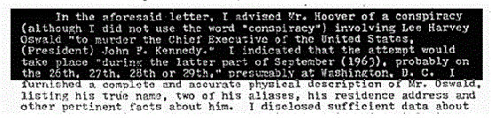 Let us describe another crevice in Baer’s early presentation. One of the very few documents Baer shows the audience which actually was declassified by the Assassination Records Review Board was a transcript of a call between President Johnson and FBI Director J. Edgar Hoover. In it, LBJ asks for information about Oswald in Mexico City. The call was made on the morning of November 23rd. Baer does not tell the audience that, as Rex Bradford discovered, there is no tape recording of this call, we only have a transcript. But he also does not tell his viewers that right after LBJ asked for more information, Hoover told the president that the audio tape and the picture they have of Oswald did not correspond to the man the FBI was interrogating in Dallas. In other words, the guy the CIA says was in Mexico City is not the man electronically captured by the CIA surveillance devices. (Jim Douglass, JFK and the Unspeakable, p. 80) Are we to believe that Baer read that transcript but missed that crucial piece of information? Or if he did not, he thought that it somehow was not important?