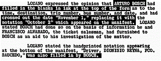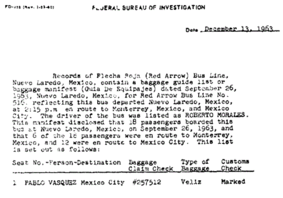 11 The last name is often misspelled as Orcabarrio or Orcaberrio. In the CuIS files, he is registered as Manuel Rodríguez Oscarberro. On the evening of November 22, 1963, DPD detective Buddy Walthers knew about someone looking very much like Oswald going into this house since October because his mother-in-law was living next door. Walthers reported it and the FBI did no more than confirm that Oscarberro and other Cuban exiles had been there and departed. Nonetheless it was noted that a source inside Alpha 66, who later moved to Puerto Rico, had furnished the information that Oswald was not associated with the group in any way and had never been to the house. Since Oscarberro did move to Puerto Rico, it is possible he was the FBI source clearing Oswald.