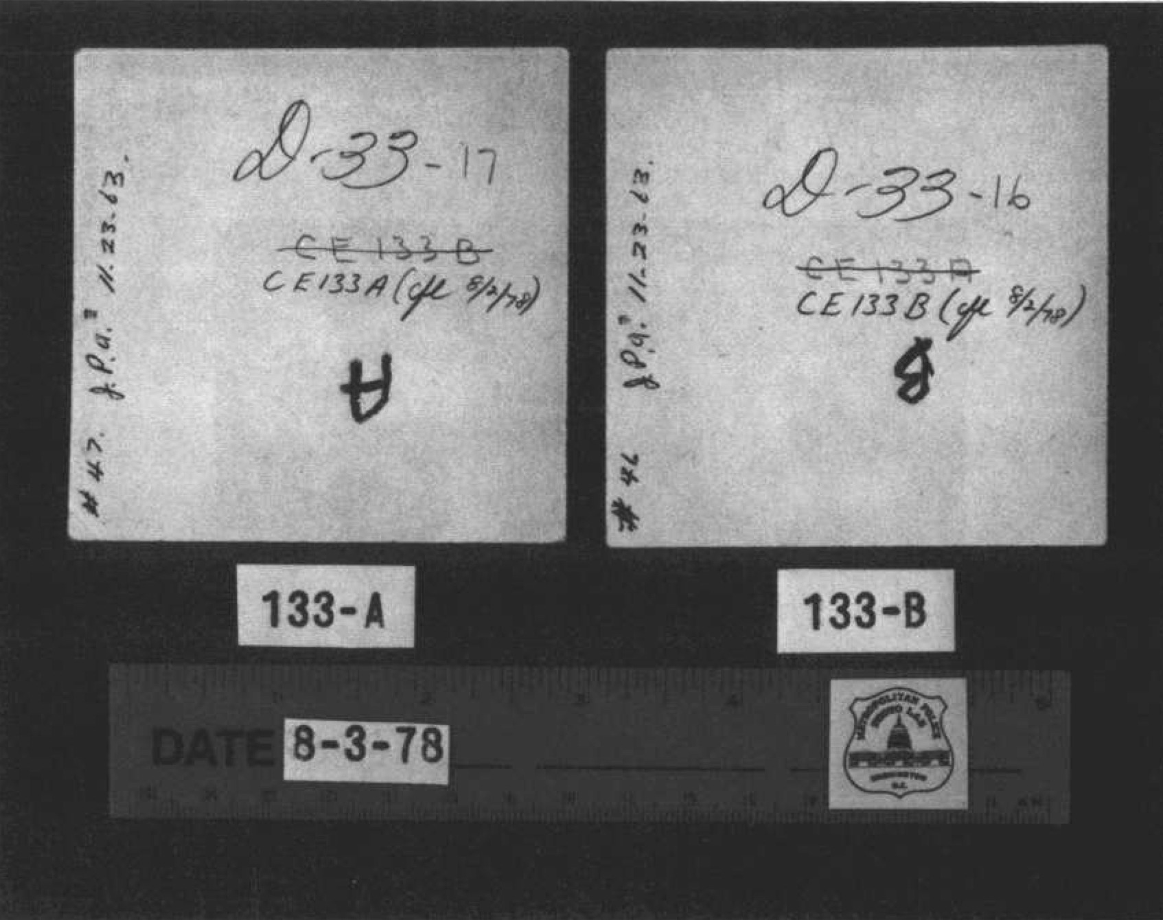 In June 1964, Special Agent Bookhout of the FBI met with Gus Rose to apparently re-establish where the backyard photos were discovered. “Rose identified same as being two photographs in a packet of forty-seven photographs found by him in a box during a search of the garage at the residence of Mrs Ruth Paine … ” A few days later, Bookhout met with Detective Adamcik who “stated these are two photographs from a packet of forty-seven photographs found in the search … Adamcik stated since he was present at the search he had numbered each photograph on the back and placed his initials thereon.” Adamcik’s initials appear on the back of the drugstore prints of both 133-A and 133-B, as do the numbers 46 and 47.