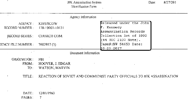 The research community also gained access to a J. Edgar Hoover memo sent to Marvin Watson, Special Assistant to the President on December 2, 1966, which described what Russian intelligence believed about the murder: