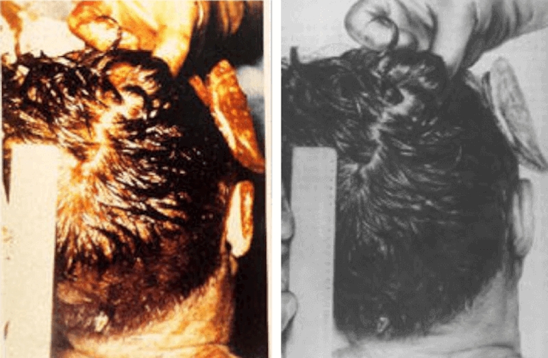 Kennedy’s hair was quite short in the back, including the area where a bullet allegedly entered. And it was even shorter below that area as it approached the neck. As you can see from the photo, the hair all around the “wound” in the cowlick is much too long.