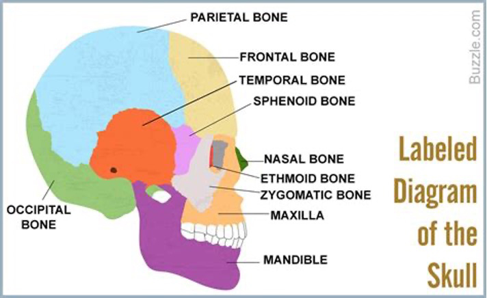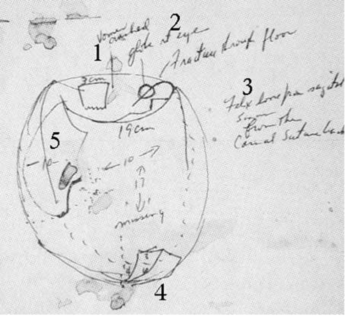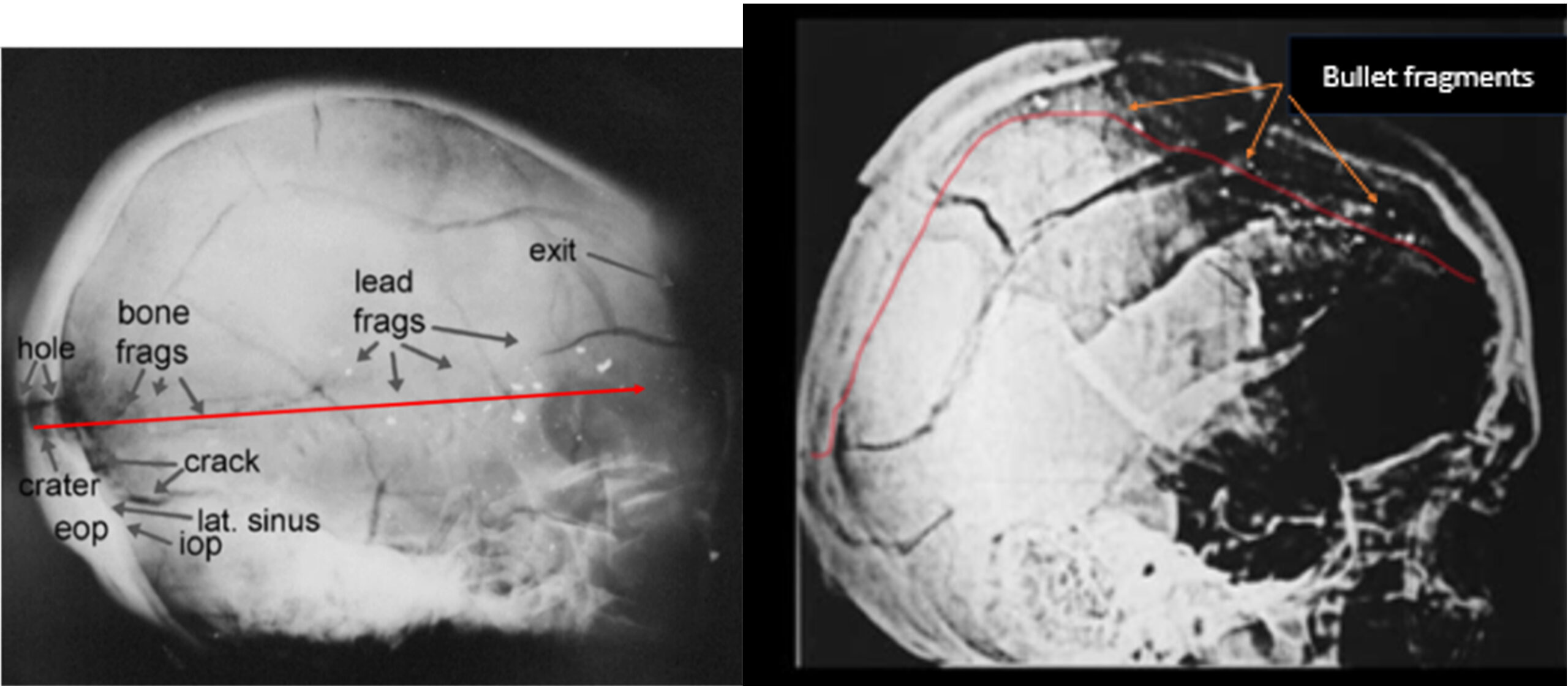 Figure 8. Left: Sturdivan reproduced an X-ray of a test skull shot with a Mannlicher round at the Biophysics Lab.[31] The fragments are small, but not “dust-like.” Not like the “snowstorm” of fragments visible in the right-front quadrant of Kennedy’s still-secret, original and unenhanced, lateral X-ray. (Which is evidence JFK was killed with a non-jacketed bullet. For “dust-like” fragments are quickly stopped by brain tissue, and so lodge close to the point of entry.) Moreover, the test skull’s fragment trail closely follows a low, little-deviated flight path across the skull, precisely as Larry Sturdivan said happens with MCC rounds.