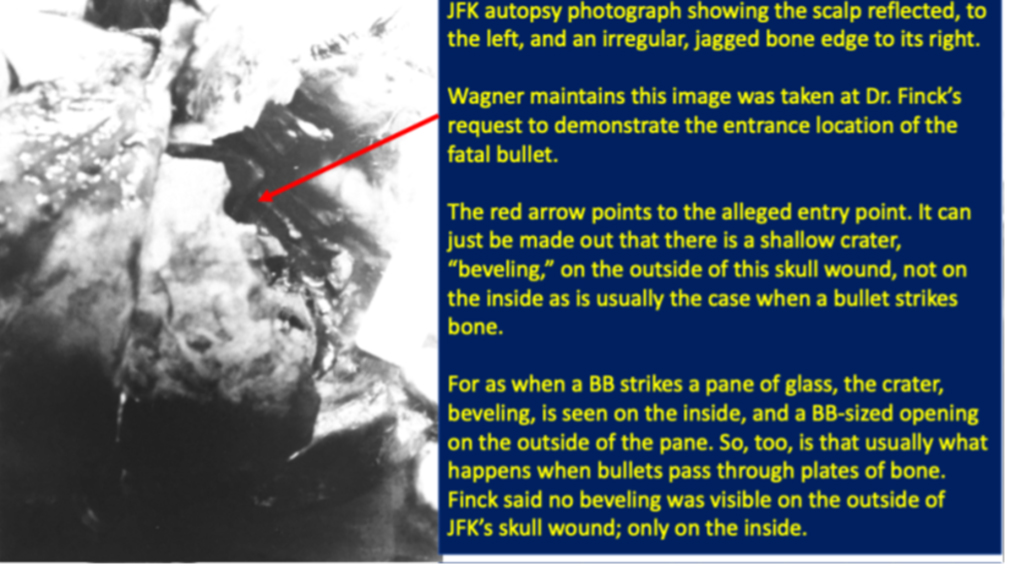 Finck: “I don’t think so and I brought with me memorandum referring to the examination of photographs in 1967… and as I can recall I never saw pictures of the outer aspect of the wound of entry in the back of the head and inner aspect in the skull in order to show a crater … I don’t remember seeing those photographs.”[26] Finck examined this photograph, which does show cratering on the outside, and he denied it was the occipital entrance photo. So how can Wagner, not a forensic pathologist, not a physician, and who wasn’t present, say that Finck, a forensic pathologist, who was there, who held JFK’s head in his hands, is wrong, and that he is right.