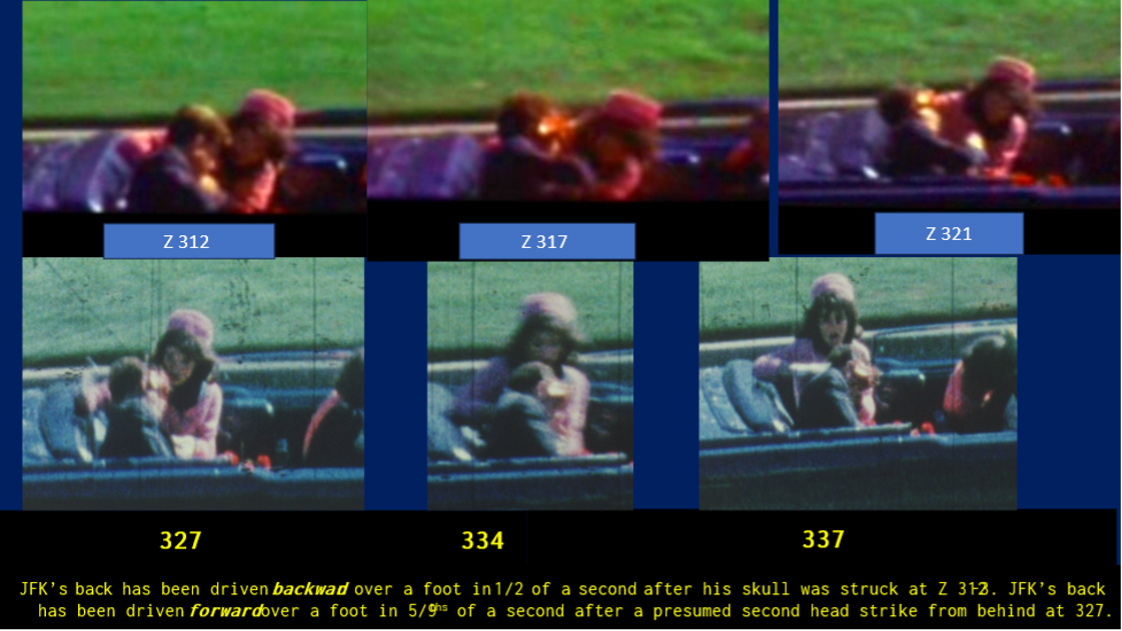 Figure 9. Kennedy’s “upper body” is “lifted against gravity” backward by the motion of his head after Z-313, just as it is similarly “lifted against gravity” forward after Z-327. (Image taken from a PowerPoint slide.)